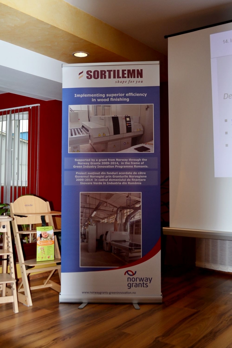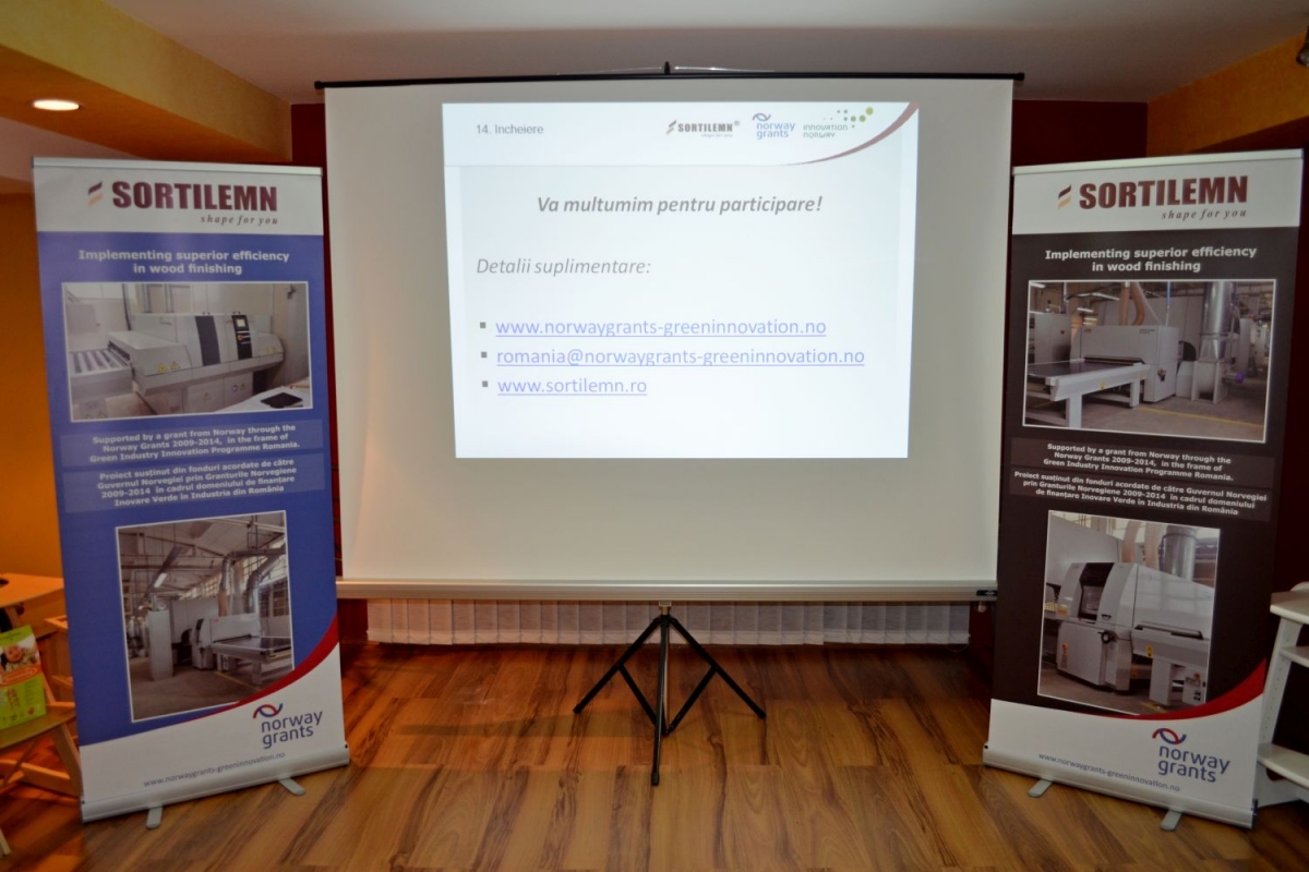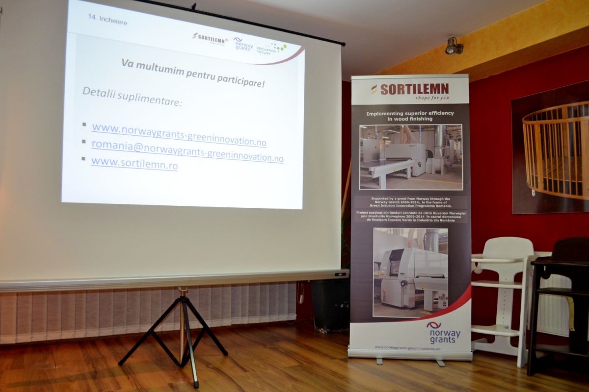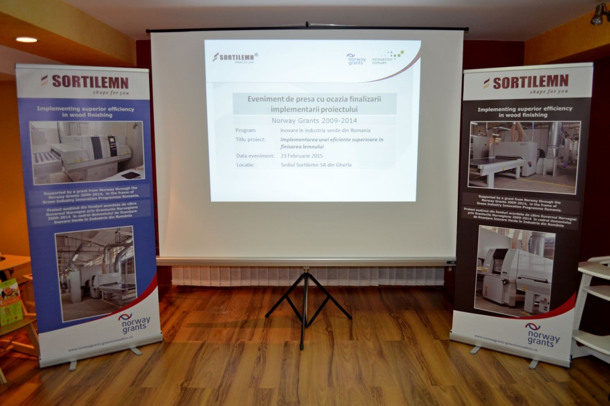Sortilemn S.A., cu sediul în România, în judeţul Cluj, strada Clujului, nr 7, Gherla, număr de telefon: 004.0264.241.717, număr de fax: 004.0264.243.148, a finalizat în cursul lunii Februarie 2015 implementarea proiectului cu titlul “Implementing superior efficiency in wood finishing“, proiect co-finaţat în cadrul programului „Inovare în Industria Verde” conform Contractului de finanţare nr. MISTE – 2013/108236, încheiat cu Innovation Norway în calitate de operator al programului.